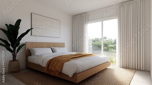 Serene bedroom featuring a minimalist design with a plant, artwork, natural light, and cozy blanket creating a tranquil ambiance.