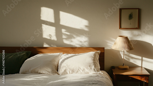 Serene bedroom featuring wooden bed frame, soft white bedding, and stylish lamp casting gentle shadows on wall. minimalist decor creates calming atmosphere