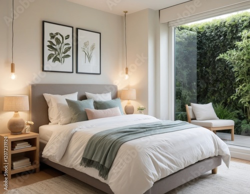 Serene Bedroom Interior Design with Green Accents and Natural Light
