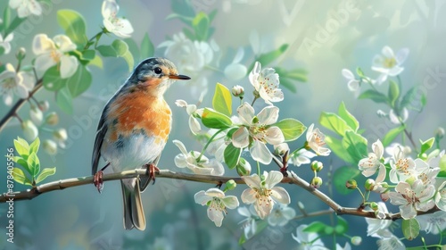 Serene Bird Perched on Blossoming Branch in Springtime Beauty