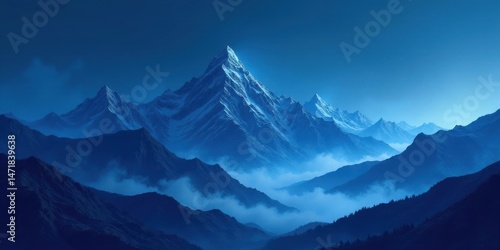 Serene Blue Mountain Range at Dusk A Majestic Panorama of Peaks and Valleys Shrouded in Mist