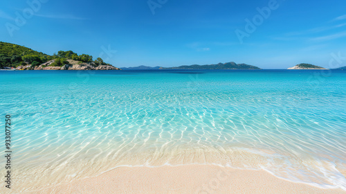 Serene Coastal Paradise, A breathtaking view of a clear beach with distant islands, showcasing a picturesque and tranquil seascape perfect for relaxation and exploration.