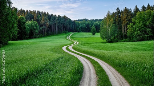 Serene Curvy Path Through Lush Green Fields Surrounded by Tall Trees Under a Clear Blue Sky