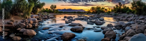 Serene desert river at sunset