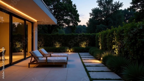 Serene Evening Ambiance Modern Patio Furniture Illuminated by Warm Outdoor Lighting on a Stone Patio next to Lush Greenery