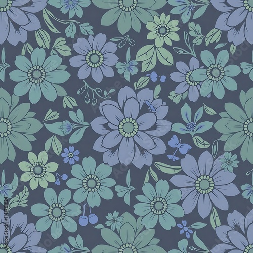Serene Floral Pattern: A tranquil and elegant seamless pattern featuring delicate blue and green floral motifs on a deep navy background. Perfect for adding a touch of sophistication to home decor.