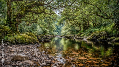 Serene Forest River with Lush Green Trees and Tranquil Water Surface