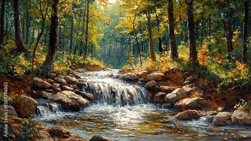 Serene Forest Stream: A Tranquil Waterfall Painting
