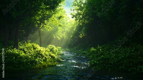 Serene Forest Stream with Sunlight Filtering Through Green Trees