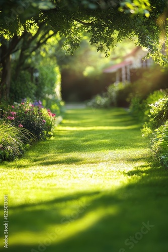 Serene Garden Pathway Surrounded by Lush Greenery and Blossoms
