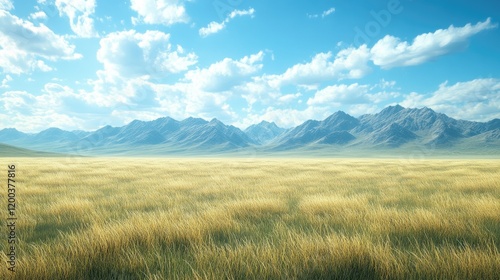 Serene Golden Grasslands and Majestic Mountains Under a Sunny Sky