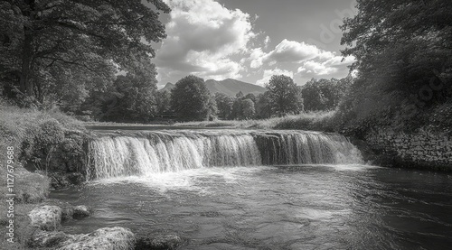 Serene grayscale landscape featuring a cascading waterfall flowing into a calm river, nestled amidst lush greenery and majestic mountains under a partly cloudy sky.