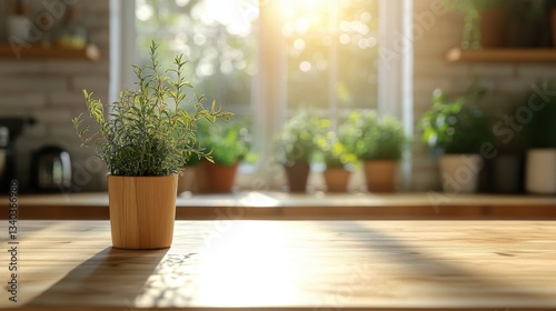 Serene kitchen scene featuring a potted rosemary plant on a wooden table bathed in sunlight creating a warm and inviting atmosphere