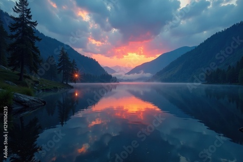 Serene lake, central flames reflecting, mystical calm, yellow, spiritual