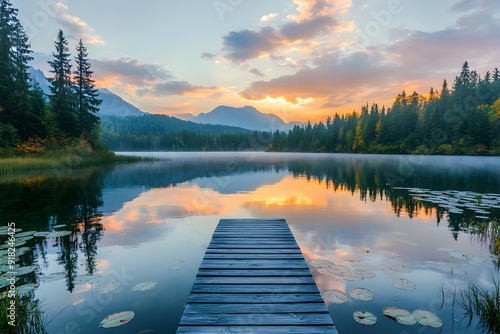 Serene Lakeside Sunset Landscape with Wooden Dock