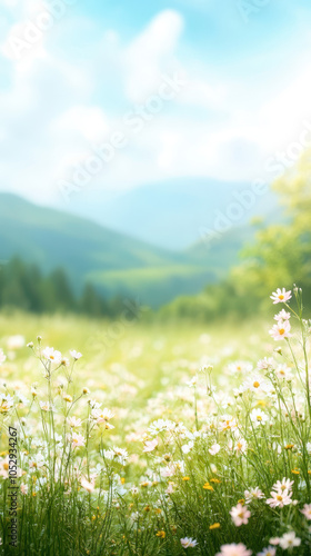 serene landscape featuring vibrant field of wildflowers under bright blue sky, with distant mountains creating peaceful backdrop. scene evokes sense of tranquility and natural beauty