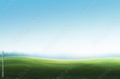 Serene landscape misty green field under a clear blue sky.