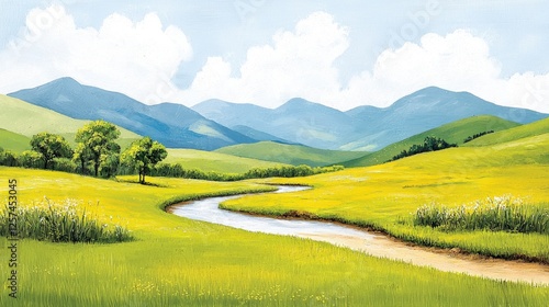 Serene Landscape with Rolling Green Hills and Gentle Stream Under Blue Sky