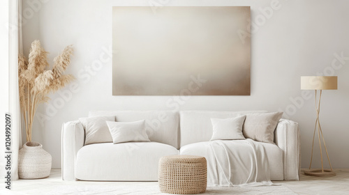 Serene Living Room: A minimalist living room design features a plush off-white sofa, complemented by neutral-toned textiles, a woven ottoman, and pampas grass in a vase.