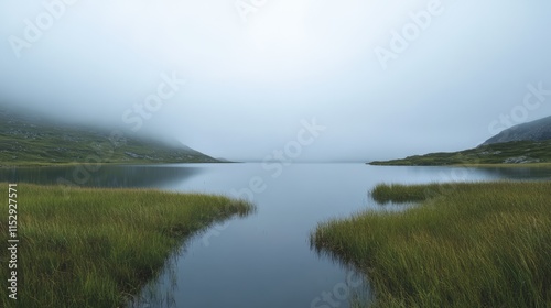 serene meadow landscape between tranquil pond and sea under overcast sky with misty hills in the background on a calm day