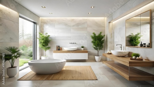 Serene Minimalism: A White Zen Bathroom with Floating Vanity and Stone Accents generative AI