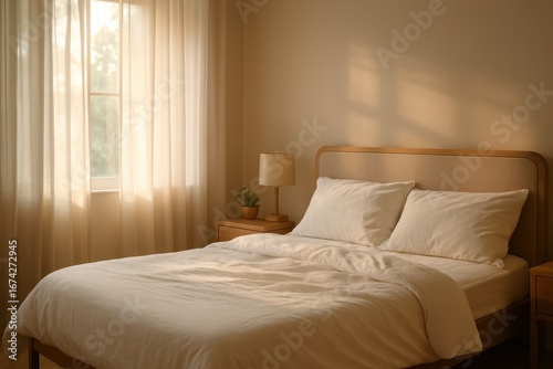 Serene Minimalist Bedroom Interior with Natural Light Streaming Through Window Creating Peaceful Morning Atmosphere