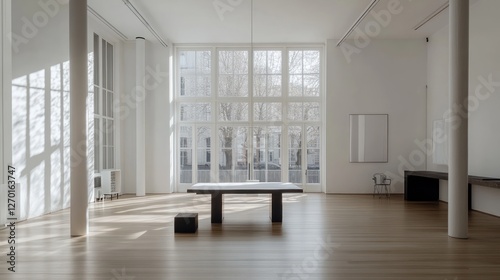 Serene Minimalist Gallery Interior with Sunlight Streaming Through Large Windows