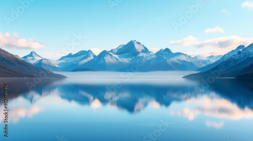 Serene mountain landscape reflecting in calm lake water under a clear blue sky, showcasing nature's beauty and tranquility.