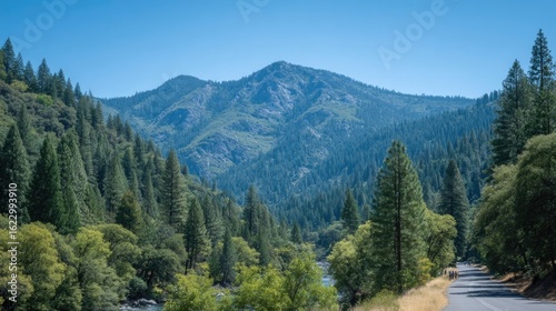 Serene mountain landscape with lush greenery and clear blue sky