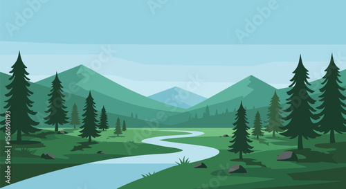 Serene Mountain Landscape with River and Pine Trees in Flat Vector Illustration Style