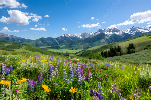 Serene Mountain Landscape with Rolling Hills, Lush Meadows, and Snow-Capped Peaks under Clear Blue Sky