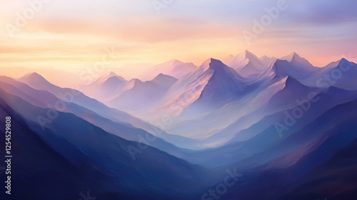 Serene mountain range landscape with pastel sky and soft light in a dreamy oil painting style