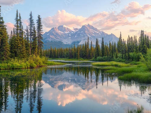 Serene Mountain Reflection in Calm Lake surrounded by Lush Forest at Dusk or Dawn