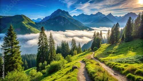 Serene mountain trail winding through lush green forest, leading to a breathtaking panoramic view of misty valleys and rugged peaks under a clear blue sky.