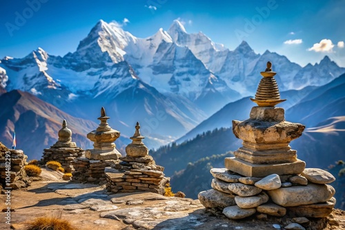 Serene Mountain View: Prayer Stones and Snow-Capped Peaks in Nepal's Tranquil Landscape