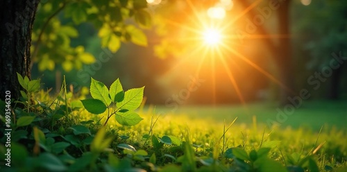 Serene nature scene at sunrise, perfect for energy meditation practices Sunlight filters through leaves, creating a peaceful atmosphere conducive to mindfulness and inner peace , spiritual, green