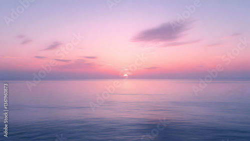 Serene Ocean Sunrise Panoramic View Soft Pastel Sky Pink Lavender Clouds Calm Sea Reflecting Light Wide Angle Tranquil Seascape Background
