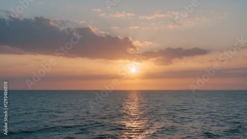 Serene ocean view at sunrise with vibrant colors and gentle waves reflecting the early morning light in a tranquil setting.