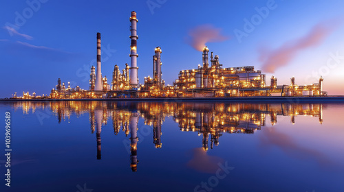 serene oil refinery plant reflecting on calm water during twilight, showcasing industrial beauty and intricate structures illuminated by warm lights