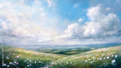Serene pastel panorama showcasing the beauty of gentle sloping meadows fluffy cumulus cloud formations and delicate petals scattered across the ground