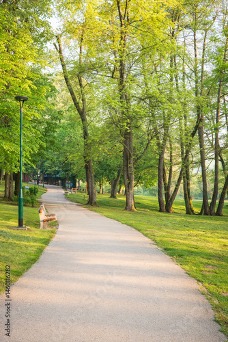 Serene Pathway: A peaceful park scene with a winding path lush trees and a bench Perfect for a calming escape into nature's beauty