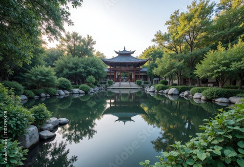 Serene Pavilion Reflecting in Pond