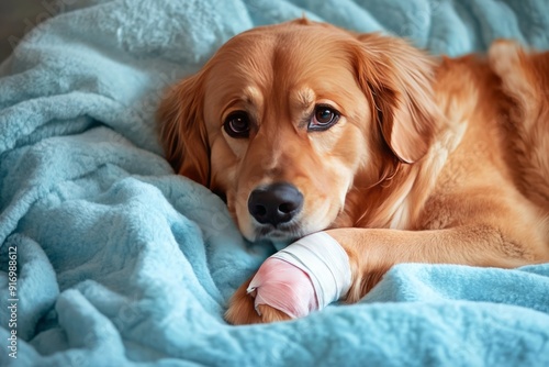 Serene Recovery: A Dog with a Bandaged Paw Resting Peacefully on a Gentle Blue Blanket