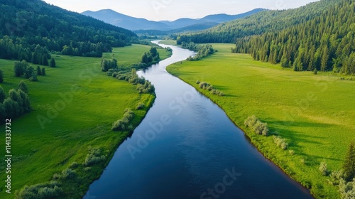 Serene River Flowing Through Lush Green Landscape