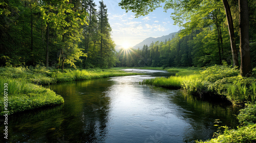 Serene river flows through lush green forest, illuminated by warm sunlight
