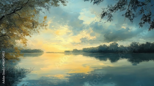 Serene River Landscape with Golden Sunset and Silhouetted Trees