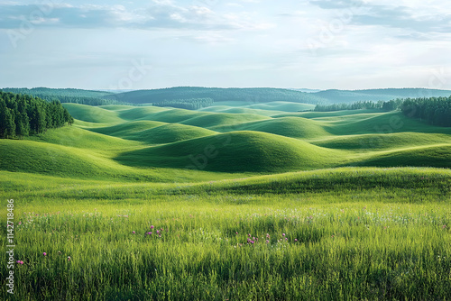 Serene rolling green hills landscape, sunrise, wildflowers, forest backdrop, nature travel poster.