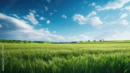 Serene rural landscape with a vibrant green wheat field under a clear blue sky with fluffy white clouds