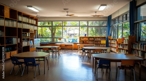 Serene School Library: Sunlight Streaming Through Large Windows