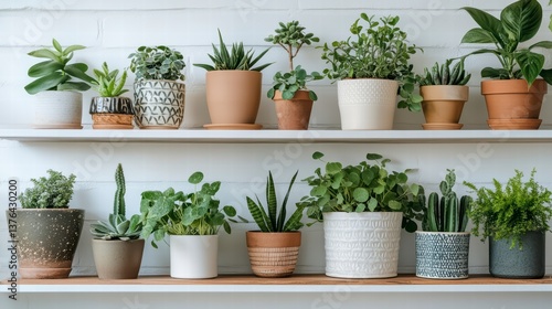 Serene Shelf Garden: Various potted plants are thoughtfully arranged on shelves, evoking a sense of tranquility and harmony with nature.